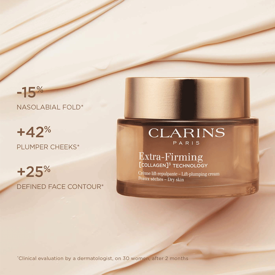 Această cremă de zi de la Clarins este parte din gama „Extra-Firming” și este gândită special pentru pielea uscată care are nevoie nu doar de hidratare, ci și de o susținere a fermității. Clarins a dezvoltat o tehnologie unică, numită [COLLAGEN]³ Technology, menită să stimuleze rezervele de colagen ale pielii și să contribuie astfel la un efect de lifting și contur mai definit.