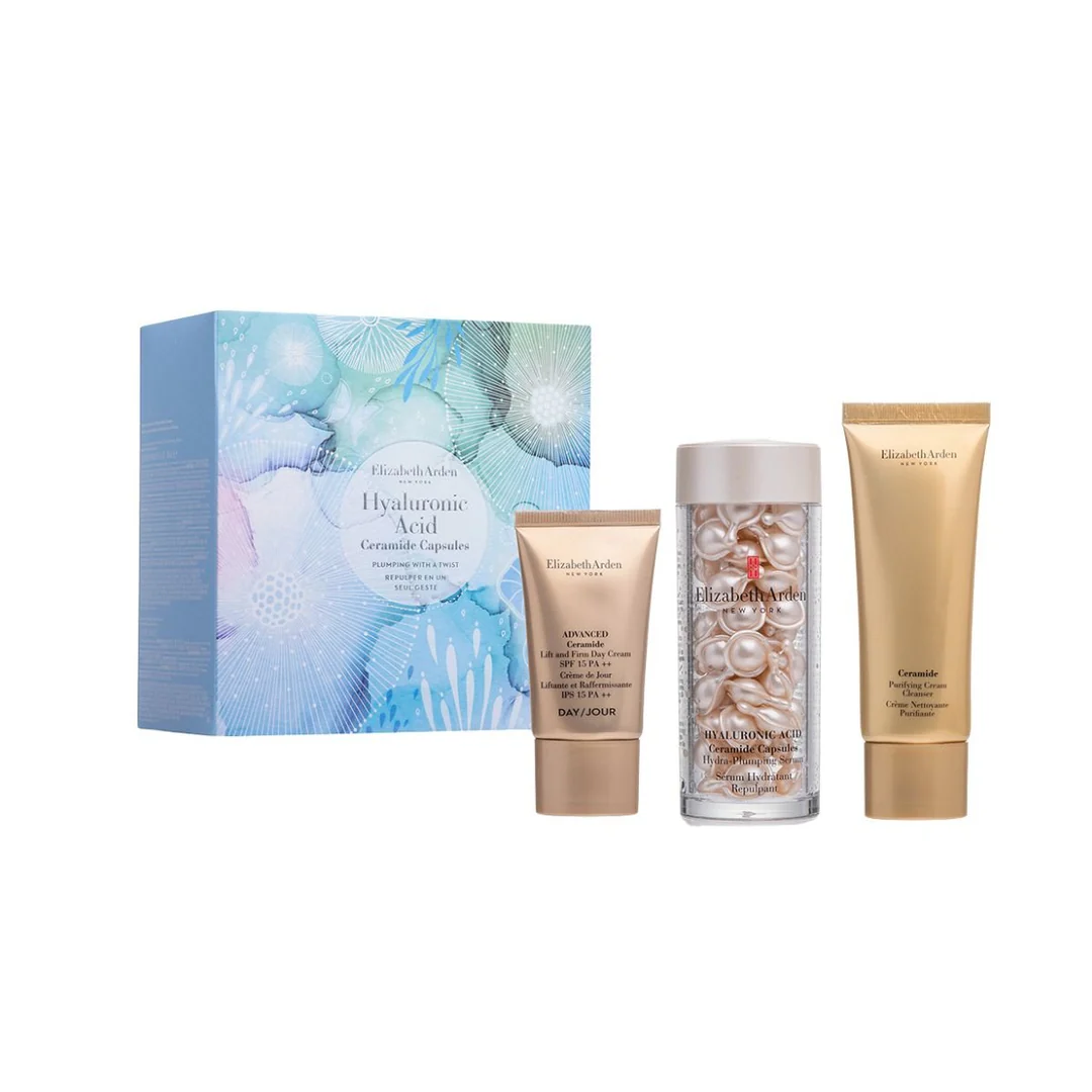 Elizabeth Arden Hyaluronic Acid Ceramide Capsules Plumping Gift Set este un set avansat de ingrijire faciala, conceput pentru hidratare intensa, fermitate si redarea volumului pielii.