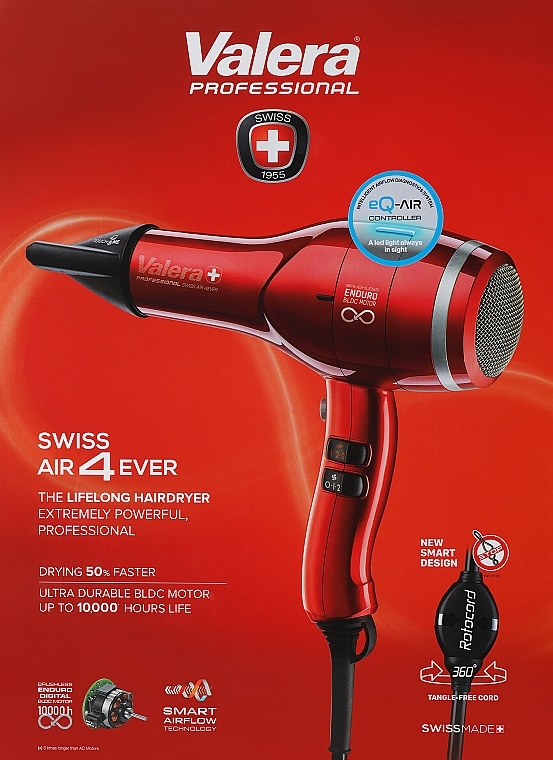 Valera Swiss Air4ever eQ RC D este un uscător de păr de înaltă performanță, proiectat pentru femeile care doresc rezultate rapide, eficiente și delicate cu părul lor. Acest uscător combină tehnologia profesională cu funcționalități moderne care protejează fibra capilară și oferă o uscare uniformă și controlată.