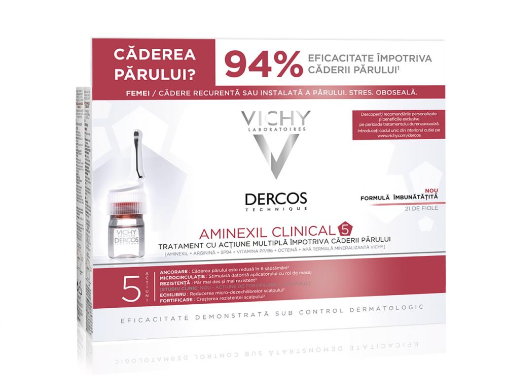 Vichy Dercos Aminexil Clinical 5 – tratament anti‑cădere pentru femei (21 fiolă x 6 ml)